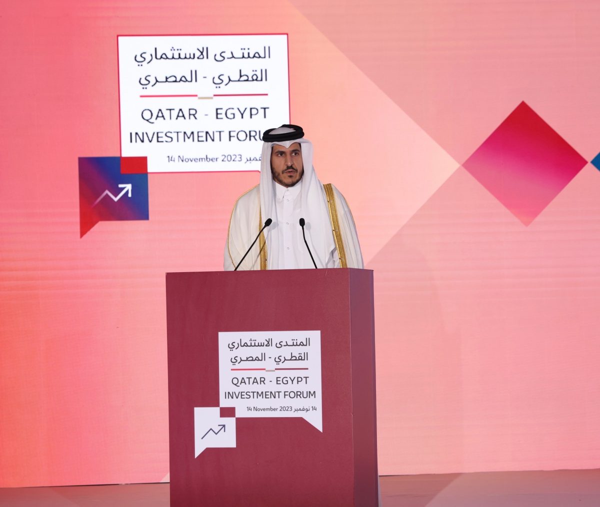The Qatari-Egyptian Investment Forum, which took place in Cairo on Tuesday, November 14th, was officially inaugurated by His Excellency Sheikh Mohammed Bin Hamad Bin Qassim Al-Thani, the Minister of Commerce and Industry; His Excellency Eng. Ahmed Samir Saleh, the Minister of Trade and Industry; and His Excellency Eng. Mahmoud Esmat, the Minister of Public Enterprise of Egypt.
