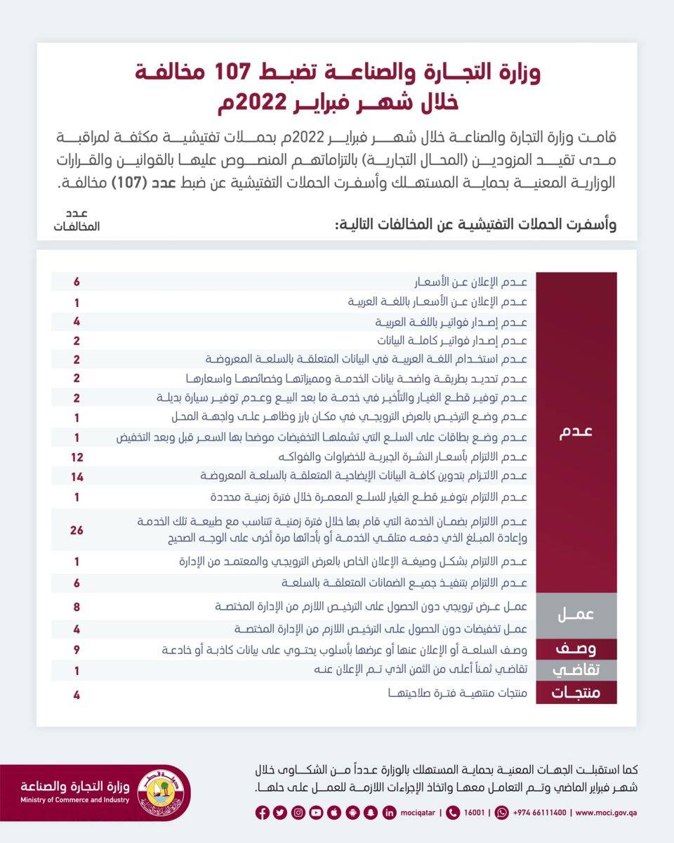 وتحث وزارة التجارة والصناعة جميع المستهلكين بالإبلاغ عن أي تجاوزات أو مخالفات وتستقبل الشكاوى والاقتراحات من خلال قنوات التواصل التالية: