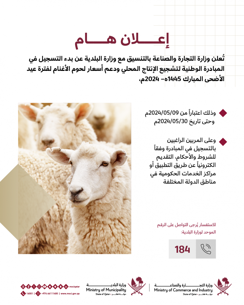 أعلنت وزارة التجارة والصناعة بالتنسيق مع وزارة البلدية عن بدء التسجيل في المبادرة الوطنية لتشجيع الإنتاج المحلي ودعم أسعار لحوم الأغنام لعيد الأضحى المبارك 1445 ه – 2024 م، وذلك اعتباراً من تاريــــــــــــــــــــخ 9 وحتى 30 مايو الجاري.
