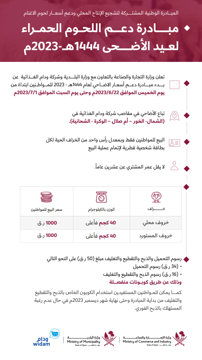 وأشارت وزارة التجارة والصناعة إلى أن الأضاحي ستباع في المقاصب التابعة لشركة ودام الغذائية في كل من الشمال والخور وأم صلال والوكرة والشيحانية. وأكدت أن مبادرة البيع تشمل المواطنين فقط، وبمعدل رأس واحد من الخراف الحية، ويجب إبراز البطاقة الشخصية القطرية لإتمام عملية البيع، وألا يقل عُمر المشتري عن عشرين عاماً.