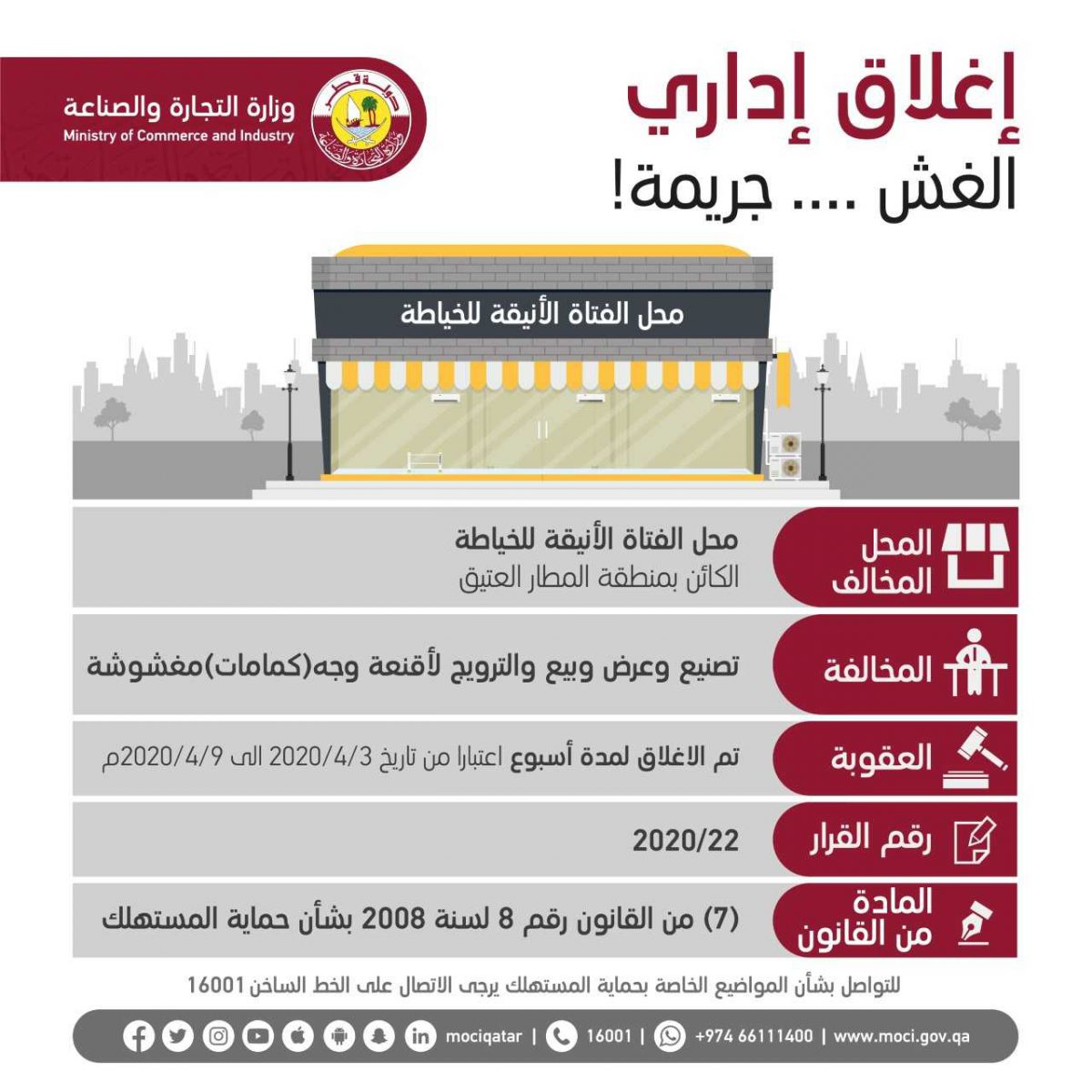 أعلنت وزارة التجارة والصناعة عن إغلاق محلا للخياطة بمنطقة المطار القديم، لمدة أسبوع، إثر قيامه بتصنيع وبيع وعرض والترويج لأقنعة الوجه (كمامات) مغشوشة.